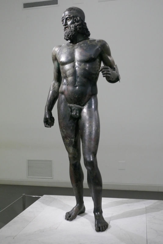 A primary focus of our visit were the Bronzes of Riace. Few bronze statues have survived as most of them were later melted down to make weapons. These are two of 5 that have been found in the sea. In 1972, SCUBA divers found the two here about 650 feet from shore in 26 feet of water. We saw another of the 5 when we visited Sicily in 2017. There is no way of knowing who these statues represented, but our guide called them warriors.